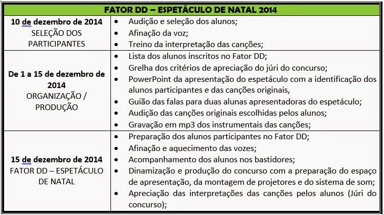 A partir da ideia dos alunos e do seu envolvimento na dinâmica da escola, com a aprovação do Conselho Pedagógico, o Departamento de Expressões – Subdepartamento de Educação Musical e a Direção procederam à preparação e organização do Fator DD - Espetáculo de Natal, tendo elaborado documentos e desencadeado as seguintes ações:
